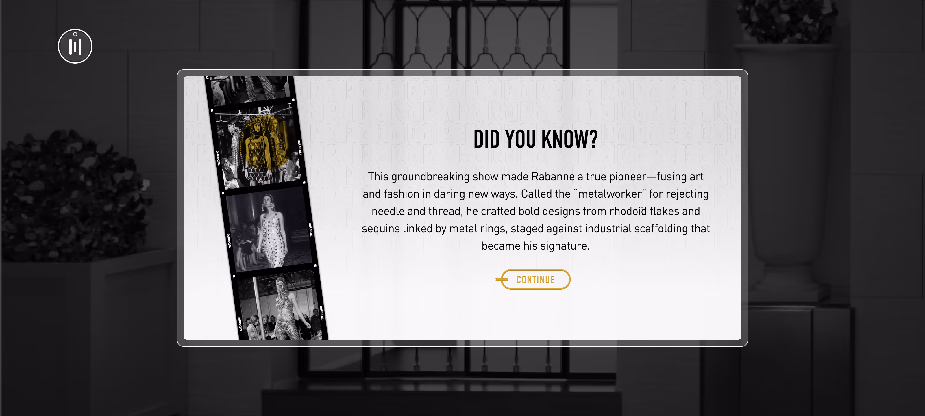 Translate this narrative into a fluid, emotional and coherent interface, where Rabanne's founding symbols, the 69 badge and the chain, guide the user and reinforce their sense of belonging.